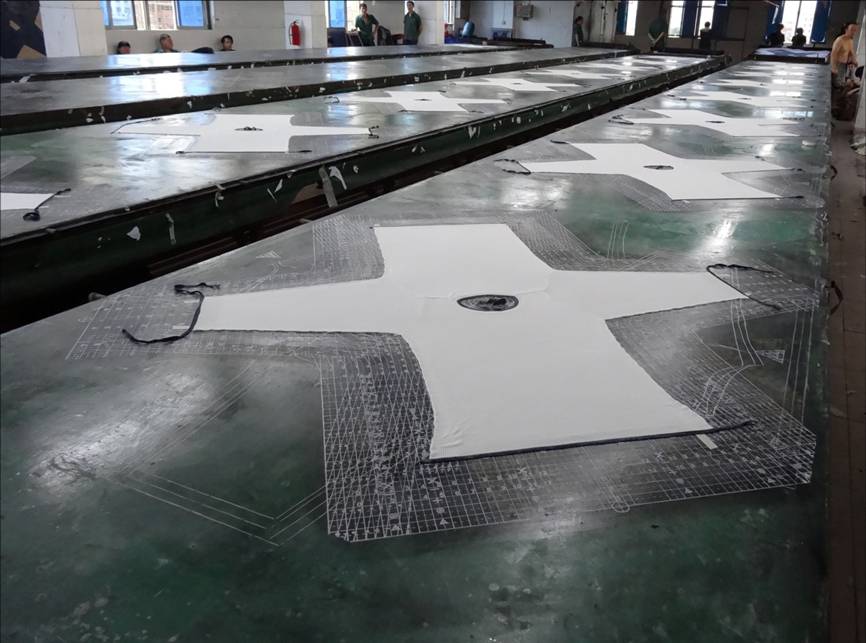 圖一  臺(tái)板上鋪貼完畢準(zhǔn)備印花的毛衫衣片